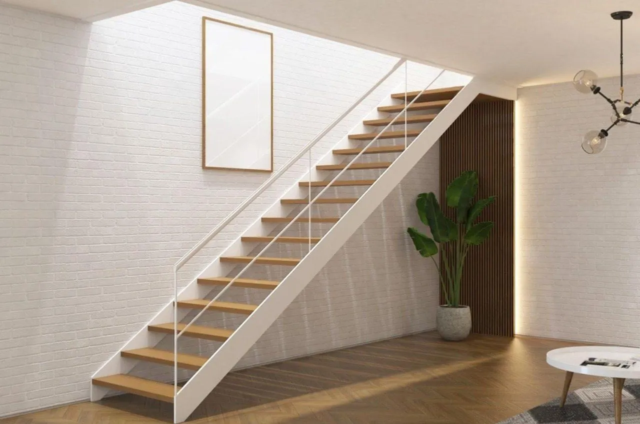 Прямая прислонённая лестница: Это самый распространенный тип, когда одна сторона лестницы крепится к несущей стене. Такой вариант идеально вписывается в классический и современный интерьер, экономит пространство, отличается прочностью и простотой монтажа.